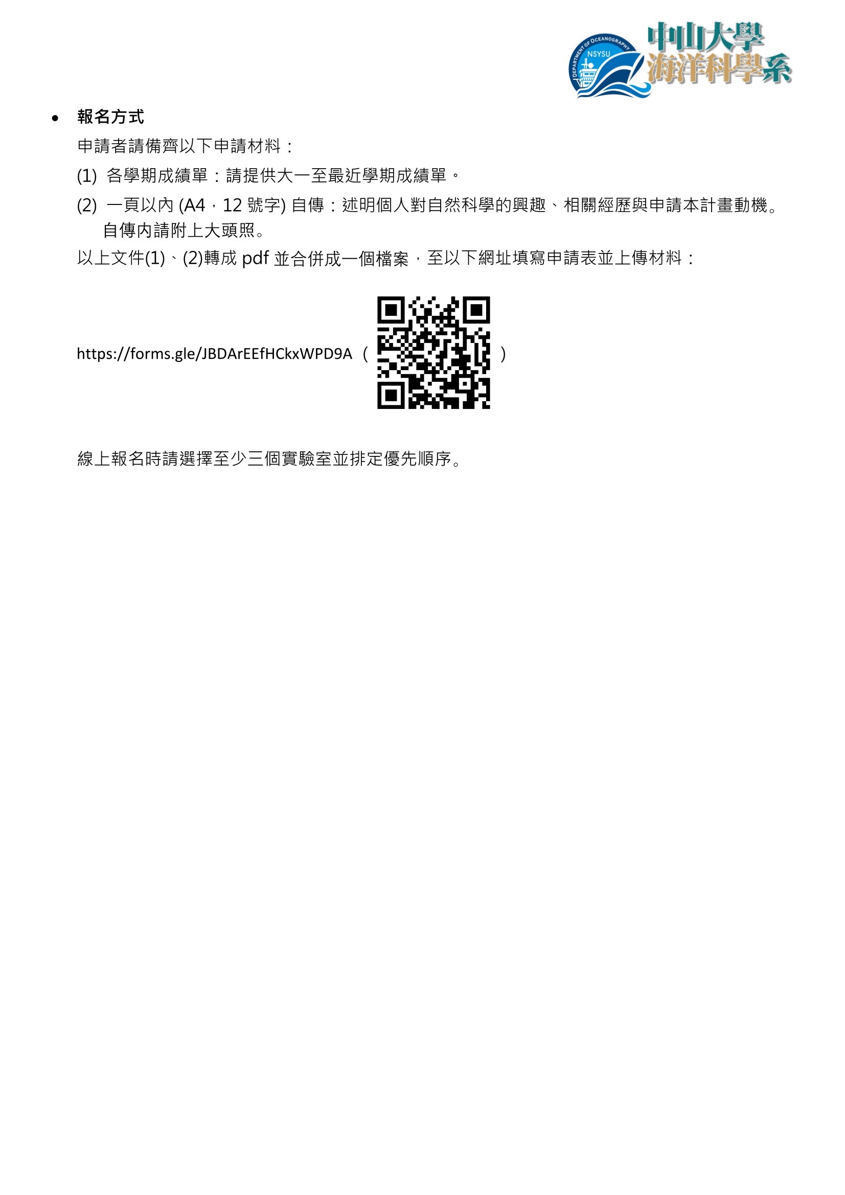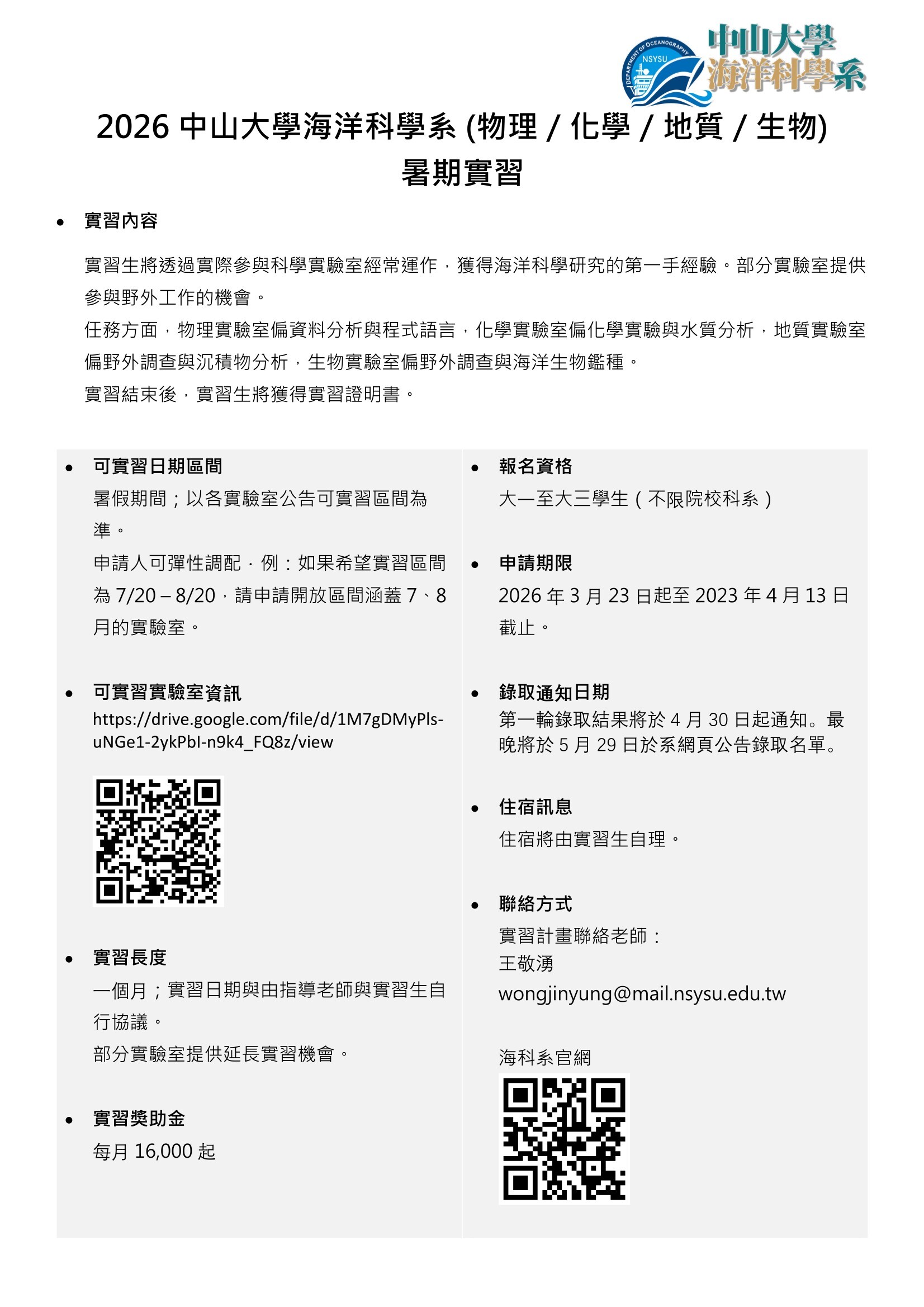 2026 中山大學海洋科學系 (物理/化學/地質/生物) 暑期實習活動,申請自3月23日起至4月13日截止