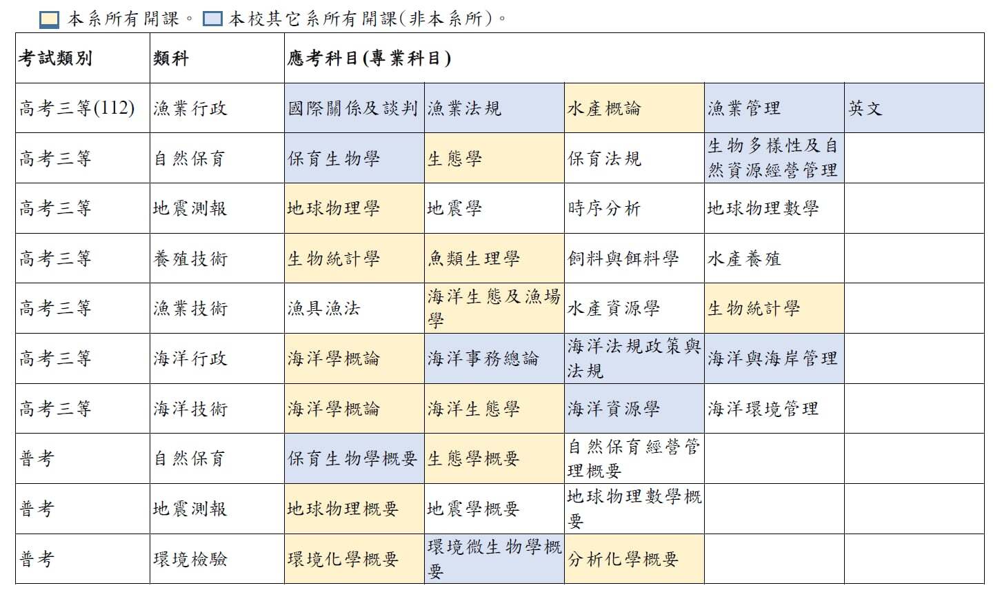 本系課程規劃亦涵蓋了國家考試、國內研究所考試的相關課程,將持續輔導有志進修學生繼續深造。自110年起國家考試高考三級新增海洋行政與海洋技術類科,亦有多位畢業校友考取,展現本系培育海洋相關專業行政與技術人員之成效。彙整與國家考試科目相關之課程如下表,未來也將因應國考考科變革進行調整。